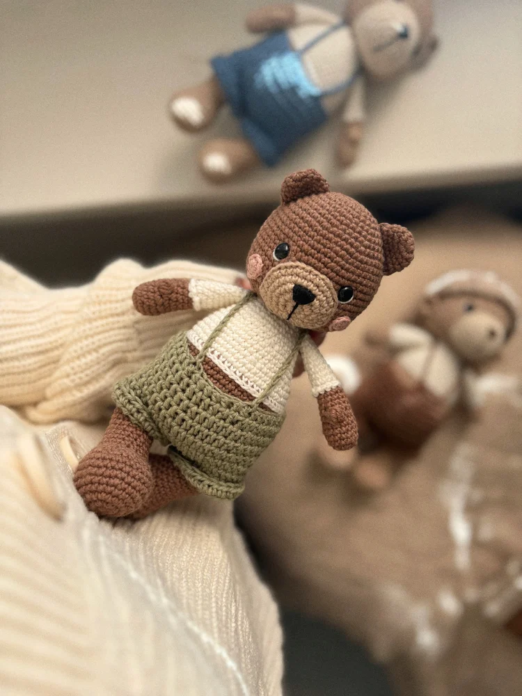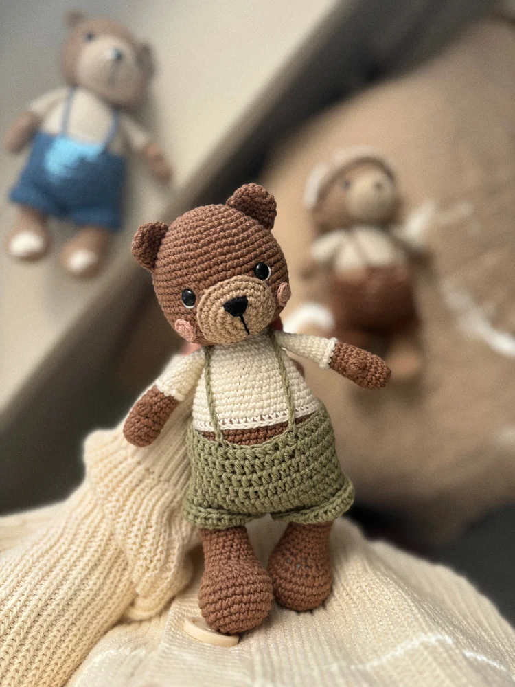 Medvedík vyrobený zo 100% bavlnenej certifikovanej priadze (certifikát OEKO TEX Standard 100 class 1, je vhodná pre deti od 0 do 3 rokov). Výplň -certifikované duté vlakno. Noštek je vyšívaný a očká sú použité bezpečnostné (odporúča sa 3+).