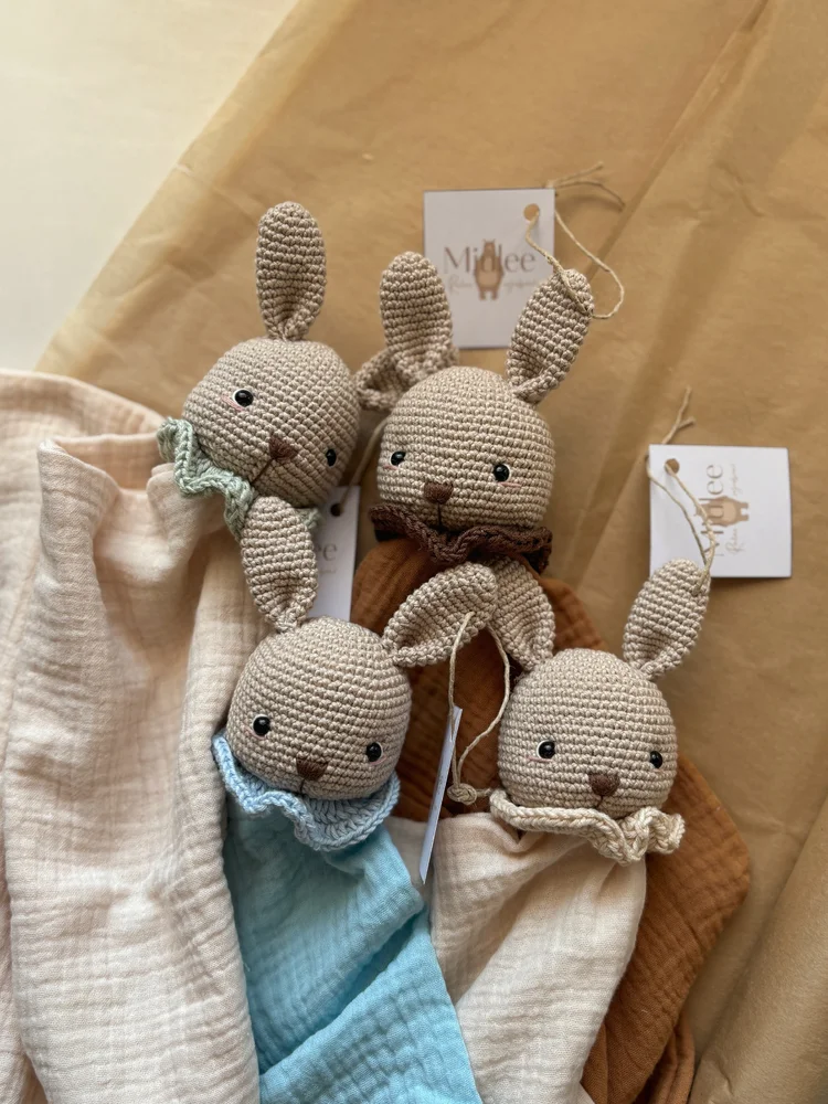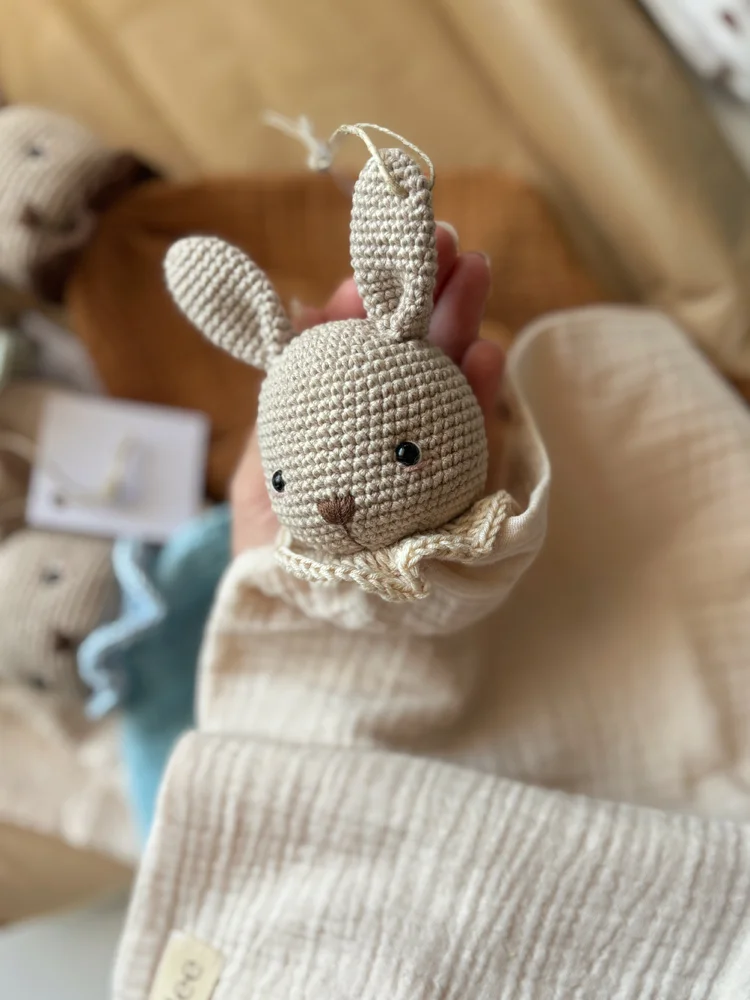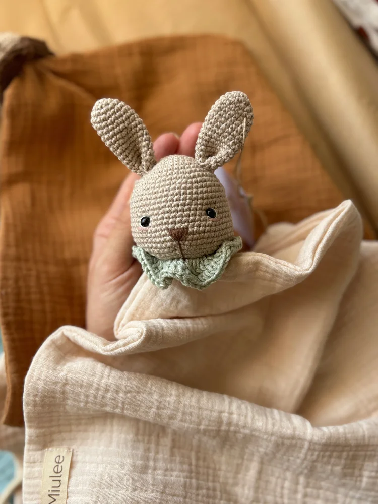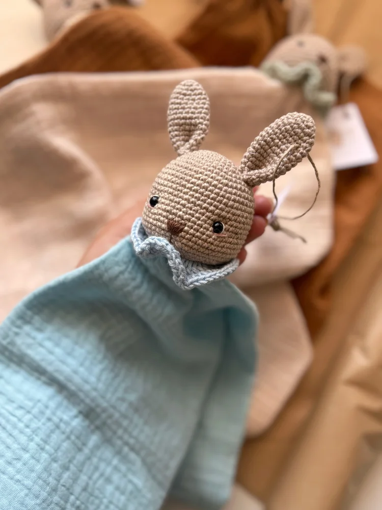 Vyrobený z bavlnenej priadze s certifikátom + bavlneného mušelínu. Tento milý jemný kamarát je ideálny pomocník pri zaspávaní či každodennom mojkaní.