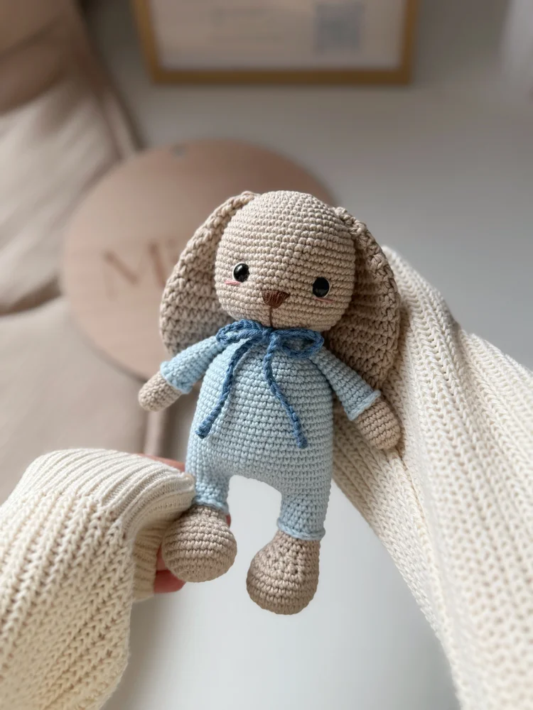 Ručne háčkovaný Miulee Zajačik je jedinečný kamarát, ktorý najskôr vzniká ako originálny Miulee návrh na papieri a následne ožíva precíznou ručnou prácou od prvej po poslednú bodku. Každý kúsok je ručne vyrobený mladou maminou na Slovensku, s dôrazom na detail, kvalitu a poctivé spracovanie.