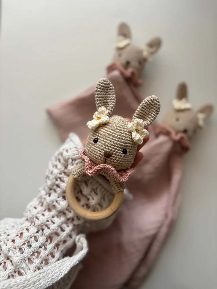 Jedinečná Zajačica Margarétka v prevedení Hrkálky alebo Mojkáčika. Vyrobená zo 100% bavlnenej priadze s certifikátom. Mojkáčik je vyrobený z bavlnenej priadze +Bavlneného mušelínu.