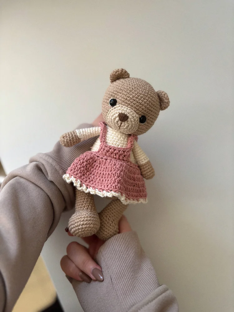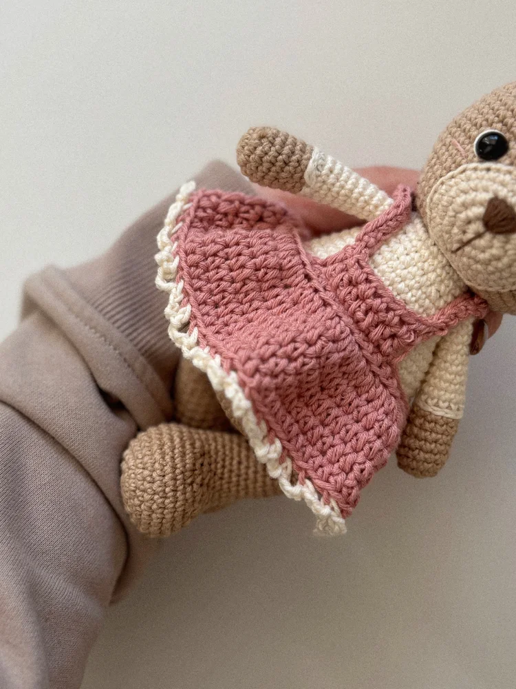 Táto roztomilá ručne háčkovaná medvedica je ideálnou hračkou pre každé dieťa. Vyrobený zo 100% prírodnej bavlny, je veľmi príjemný na dotyk. Každý medvedík je starostlivo a láskyplne ručne vyrobený, čo zaručuje jedinečnosť a vysokú kvalitu. Táto Medvedica sa stane obľúbeným spoločníkom na hranie aj na spanie a jeho prírodný materiál je ideálny pre citlivú detskú pokožku. Perfektný darček pre deti alebo ako dekorácia do detskej izby!
