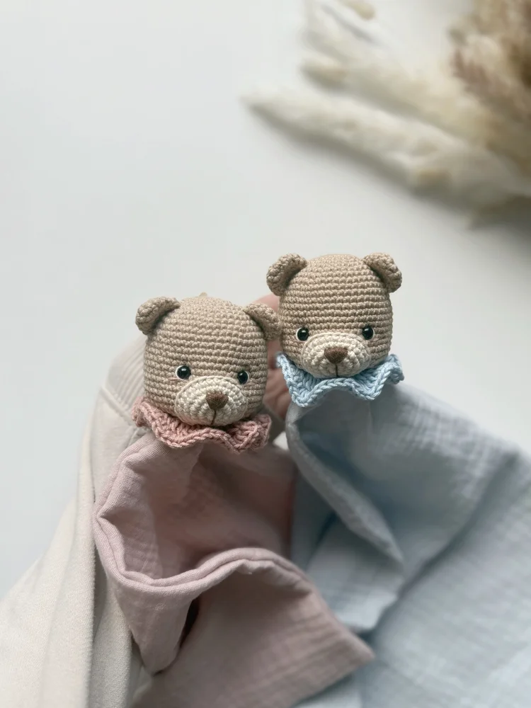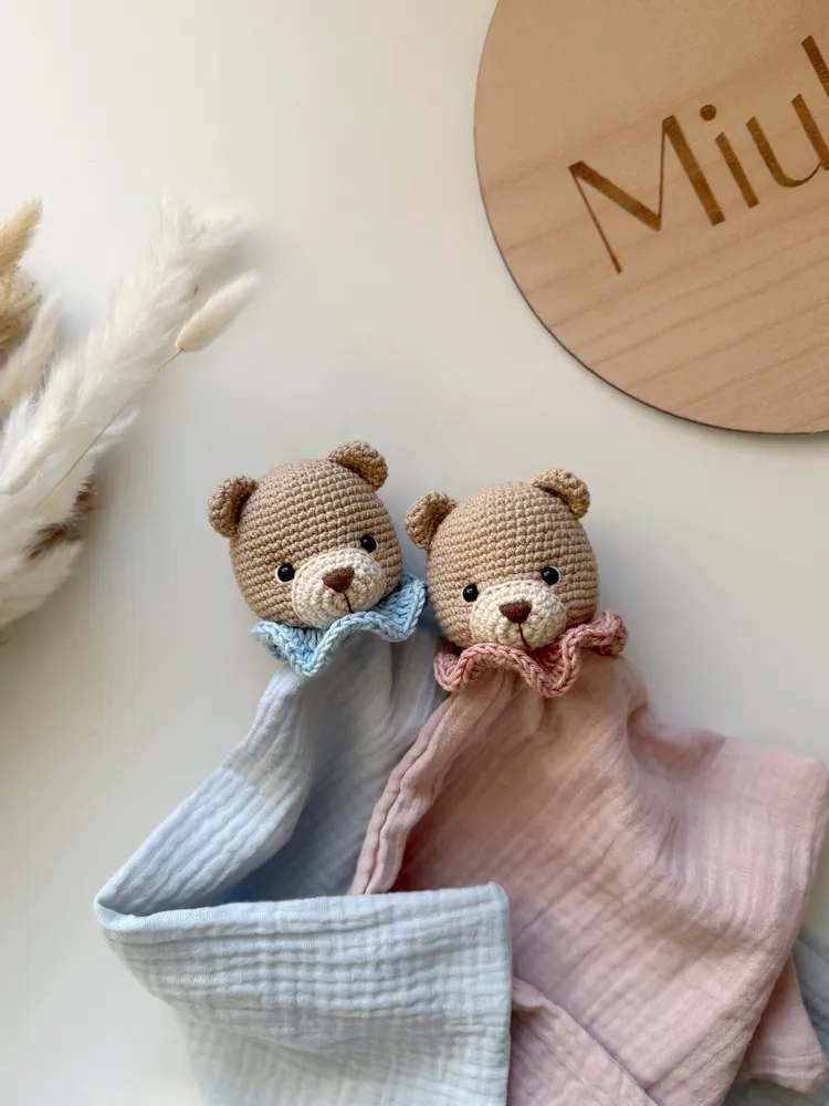 Ručne vyrobený Miulee mojkáčik ,je ručne Háčkovaný Bavlnený kamarát. Vyrobený z certifikovanej priadze OEKO-TEX® Standard 100 a mušelínovej látky zo 100 % bavlny, vhodných pre deti od 0 do 3 rokov a šetrných k citlivej detskej pokožke.