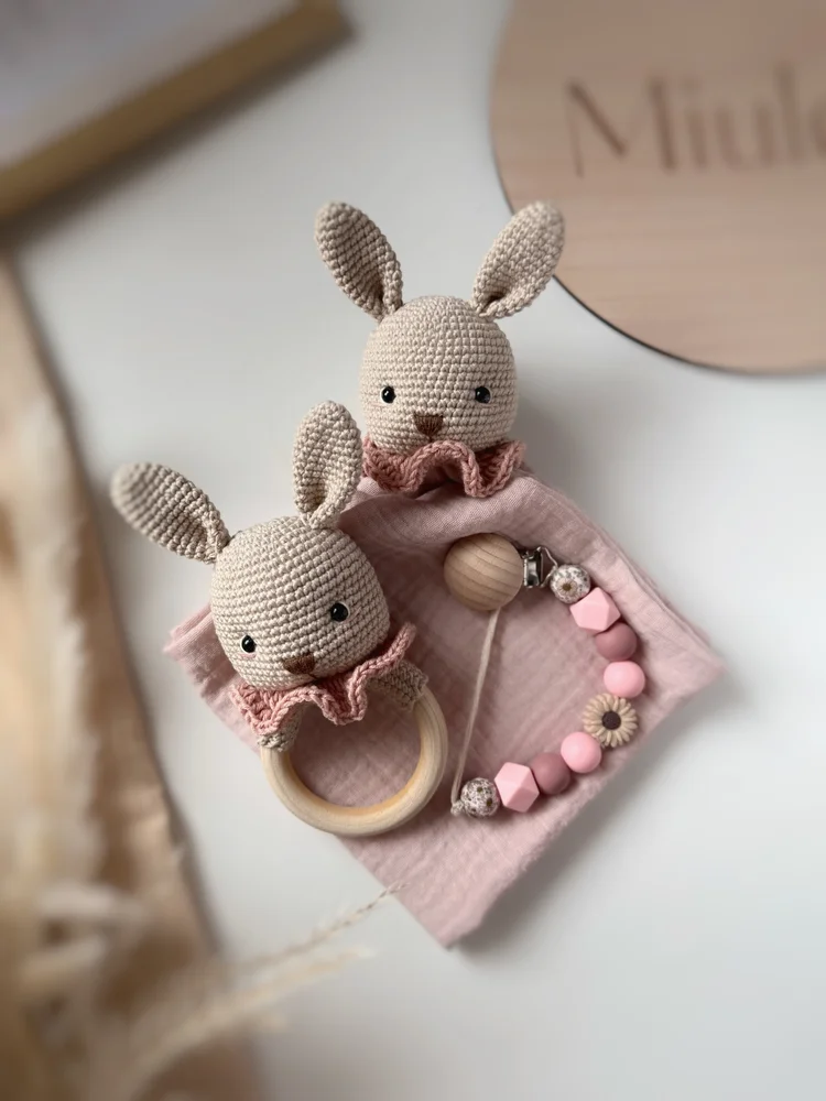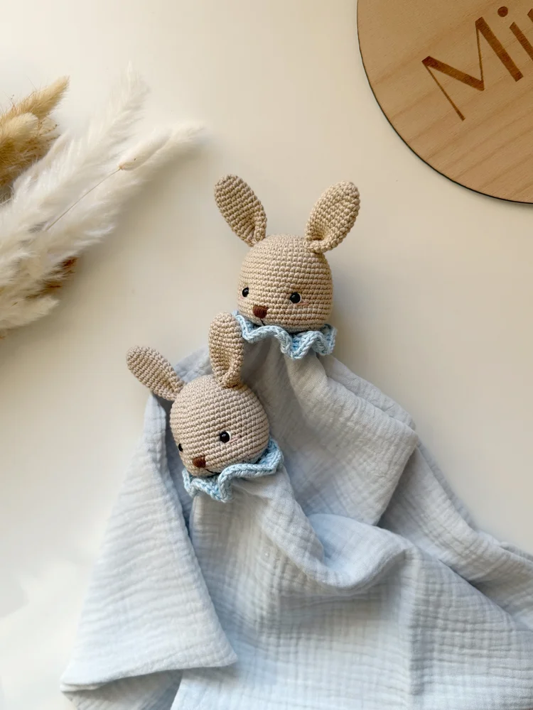 Ručne vyrobený Miulee mojkáčik ,je ručne Háčkovaný Bavlnený kamarát. Vyrobený z certifikovanej priadze OEKO-TEX® Standard 100 a mušelínovej látky zo 100 % bavlny, vhodných pre deti od 0 do 3 rokov a šetrných k citlivej detskej pokožke.