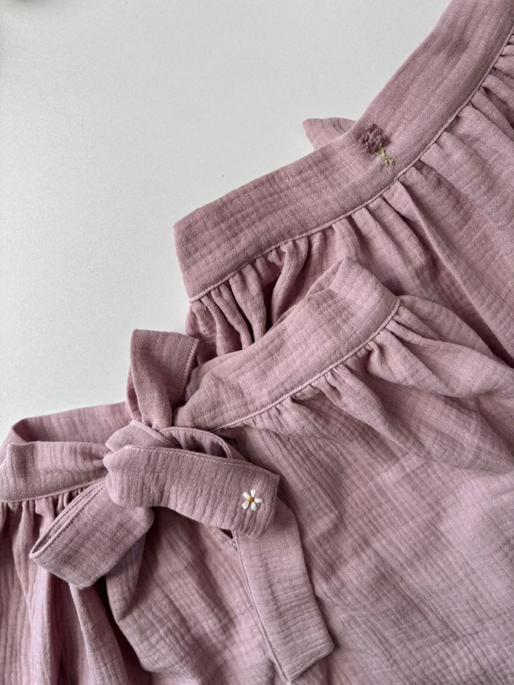 Mušelínová suknička-Bavlnený Mušelín. Veľkosť pásu je nadstaviteľný - viazanie na mašľu na zadnej strane. Veľmi príjemná jedinečná sukňa z kolekcie MIA -s jemnou výšivkou.