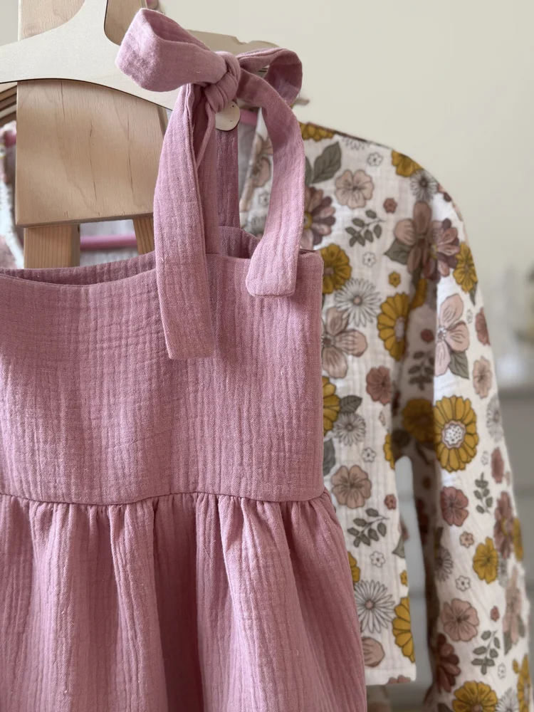 Šaty majú nastaviteľné ramienka viazané na mašličku, vďaka ktorým jednoducho prispôsobíte dĺžku – takže dieťatku vydržia dlhšie. Voľný a pohodlný strih poskytuje maximálne pohodlie pri hre aj objavovaní sveta.