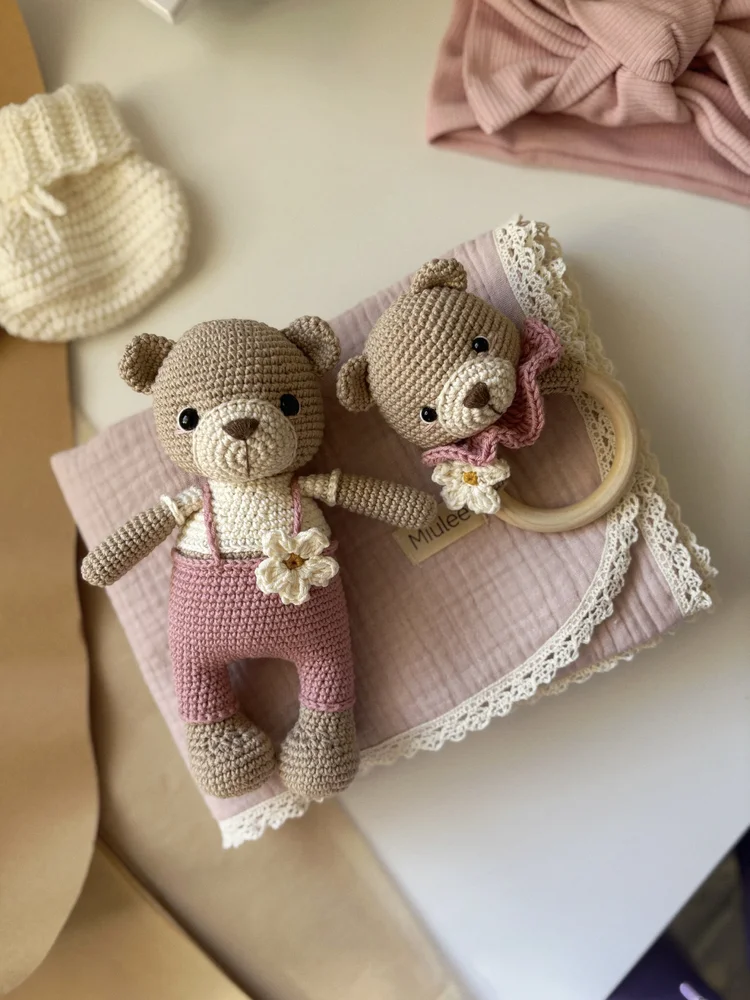 Set obsahuje: Háčkovanú medvedicu + Háčkovaná hrkálka + Mušelínová dvojvrstvovú dečka. Vyrobené zo 100% bavlny s certifikátom (vhodné 0-3).