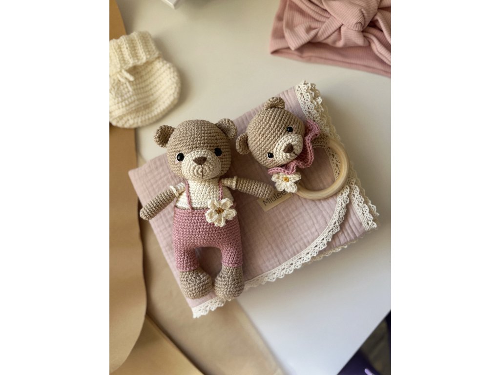 Set obsahuje: Háčkovanú medvedicu + Háčkovaná hrkálka + Mušelínová dvojvrstvovú dečka. Vyrobené zo 100% bavlny s certifikátom (vhodné 0-3).