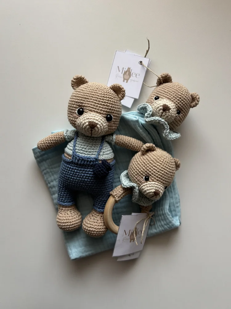 Roztomilý set ladený do modrej farby obsahuje Hračku Medvedíka ,Hrkálku a Mojkáčika s mušelínom. Tento jedinečný set je vyrobený zo 100% bavlnenej priadze s certifikátom + bavlneného mušelínu.